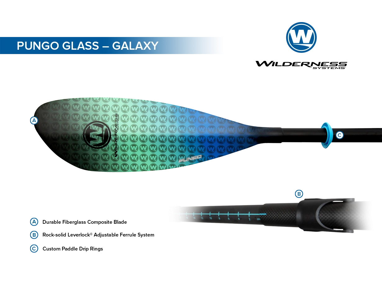 The Wilderness Systems Pungo Glass (2 piece), is designed to deliver an enhanced paddling experience with Wilderness Systems Pungo kayaks, while being an exceptional paddle for other recreational and touring kayaks. The paddle’s shape, size and proprietary blade curvature deliver the optimal angle of entry and stroke depth for smooth, efficient, flutter-free strokes regardless of paddling style or experience level. With a simple flip of a low-profile lever, the Pungo Paddle can be adjusted to fit virtually any paddler, model of kayak or stroke style.